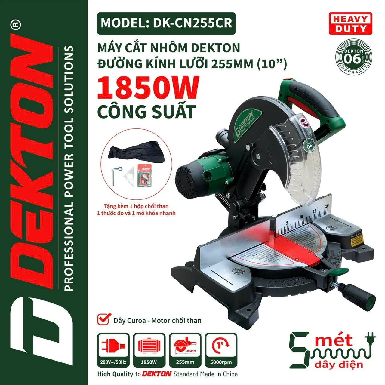Máy cắt nhôm Dekton 255CR dây curoa là máy cắt nhôm chuyên dụng dành cho thi công cửa nhôm kính, gia công tủ kệ với vết cắt chính xác, góc cắt thẳng, đẹp. Máy cắt nhôm chạy dây curoa ( máy kêu êm hơn), công suất động cơ 1850w mạnh mẽ, hoạt động ổn định. Cấu tạo máy sử dụng dây curoa tạo độ ổn định hơn, máy bền, dễ sửa chữa.